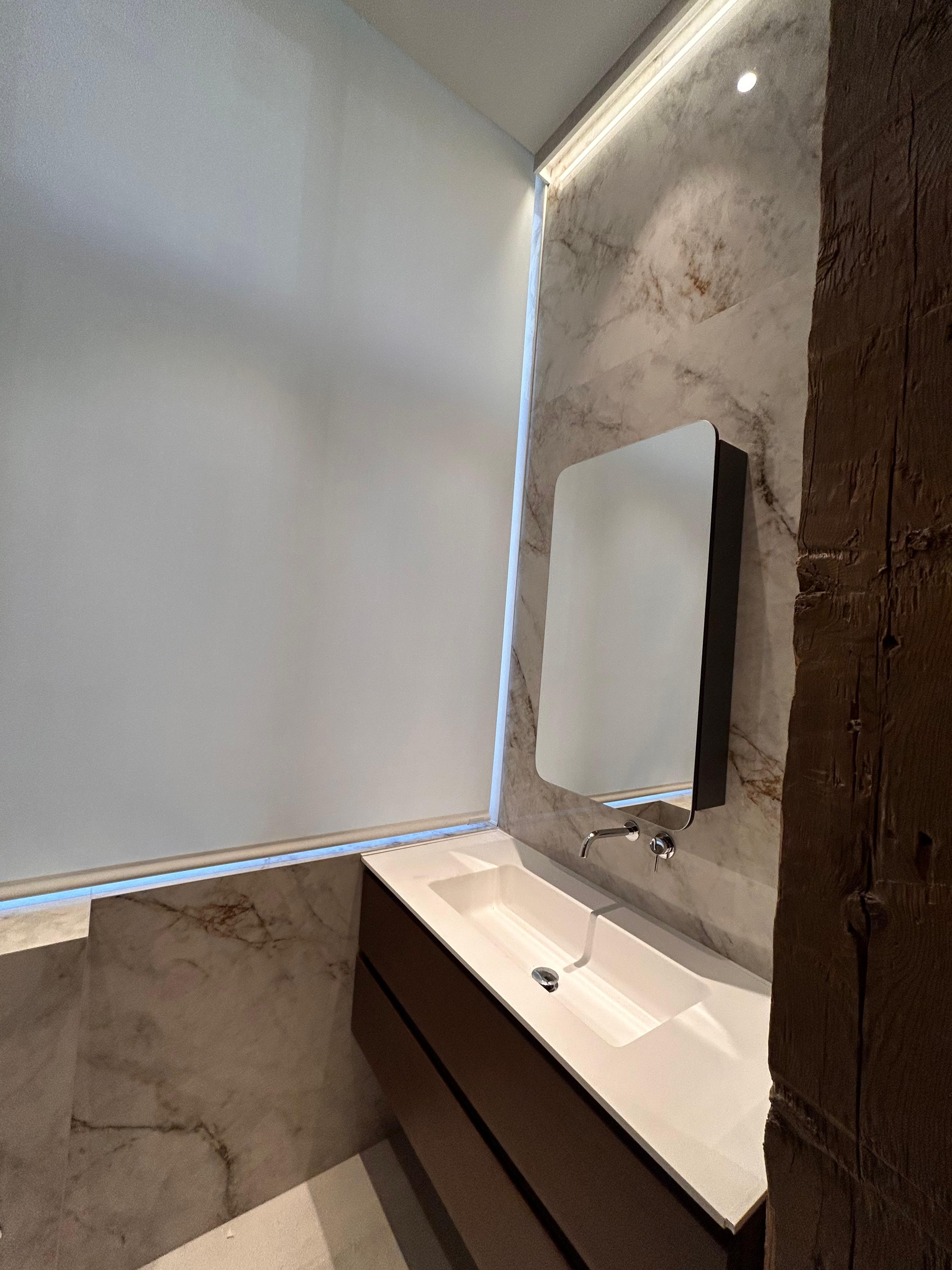 La cocina de diseño minimalista, integrada en el espacio, está equipada con electrodomésticos de última generación y detalles en acero y piedra, lo que añade un toque moderno y elegante a la funcionalidad diaria. La altura de los techos permite aprovechar el espacio vertical con estanterías y armarios personalizados, maximizando la capacidad de almacenamiento sin sacrificar el estilo.
