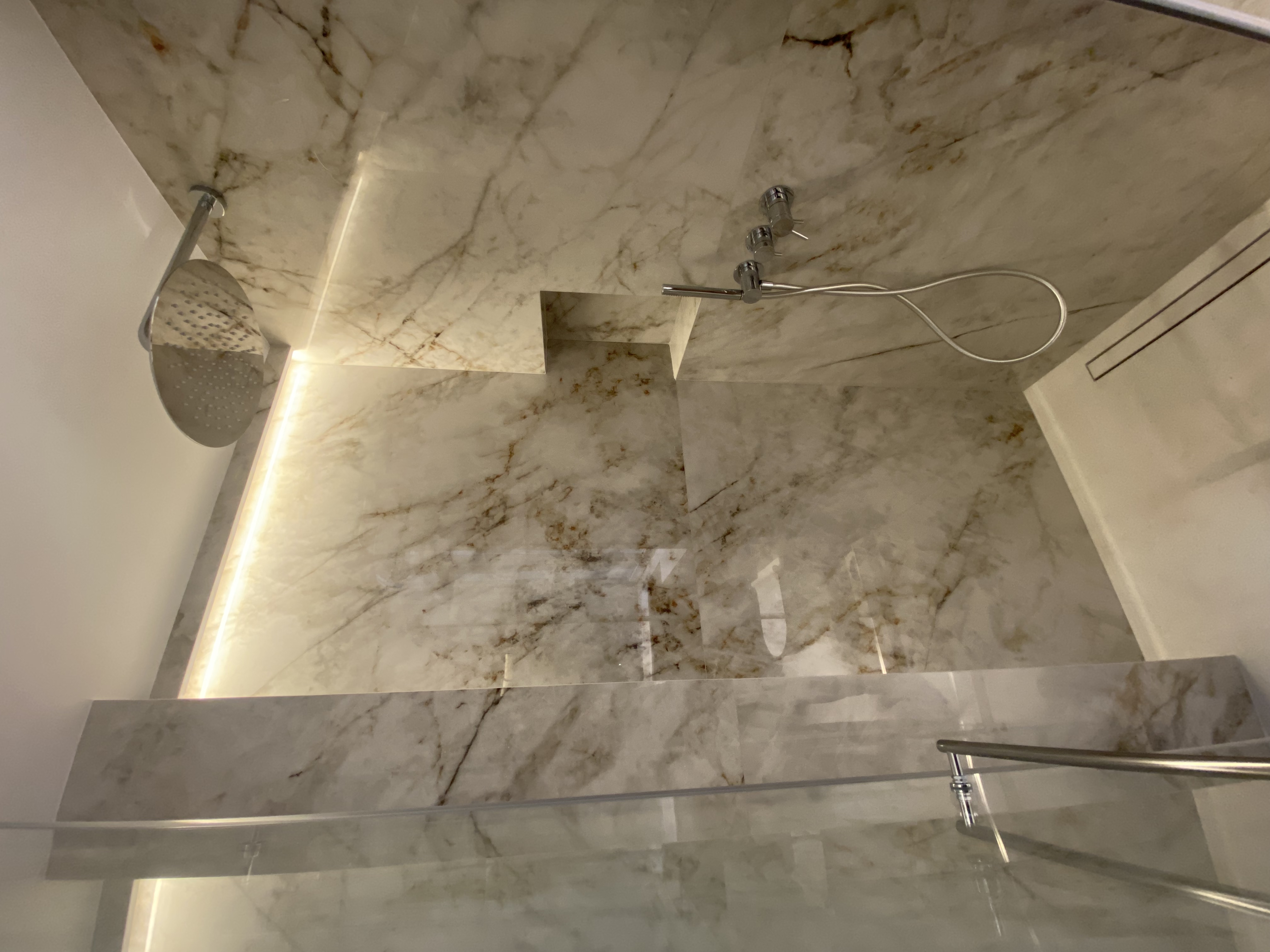 El dormitorio principal, igualmente impactante con sus techos altos, ofrece un refugio íntimo que mantiene la amplitud y luminosidad características del apartamento. Grandes armarios empotrados se integran discretamente en las paredes, mientras que el baño, de diseño contemporáneo con acabados en mármol y una ducha de efecto lluvia, completa la experiencia de lujo en un espacio íntimo y funcional.