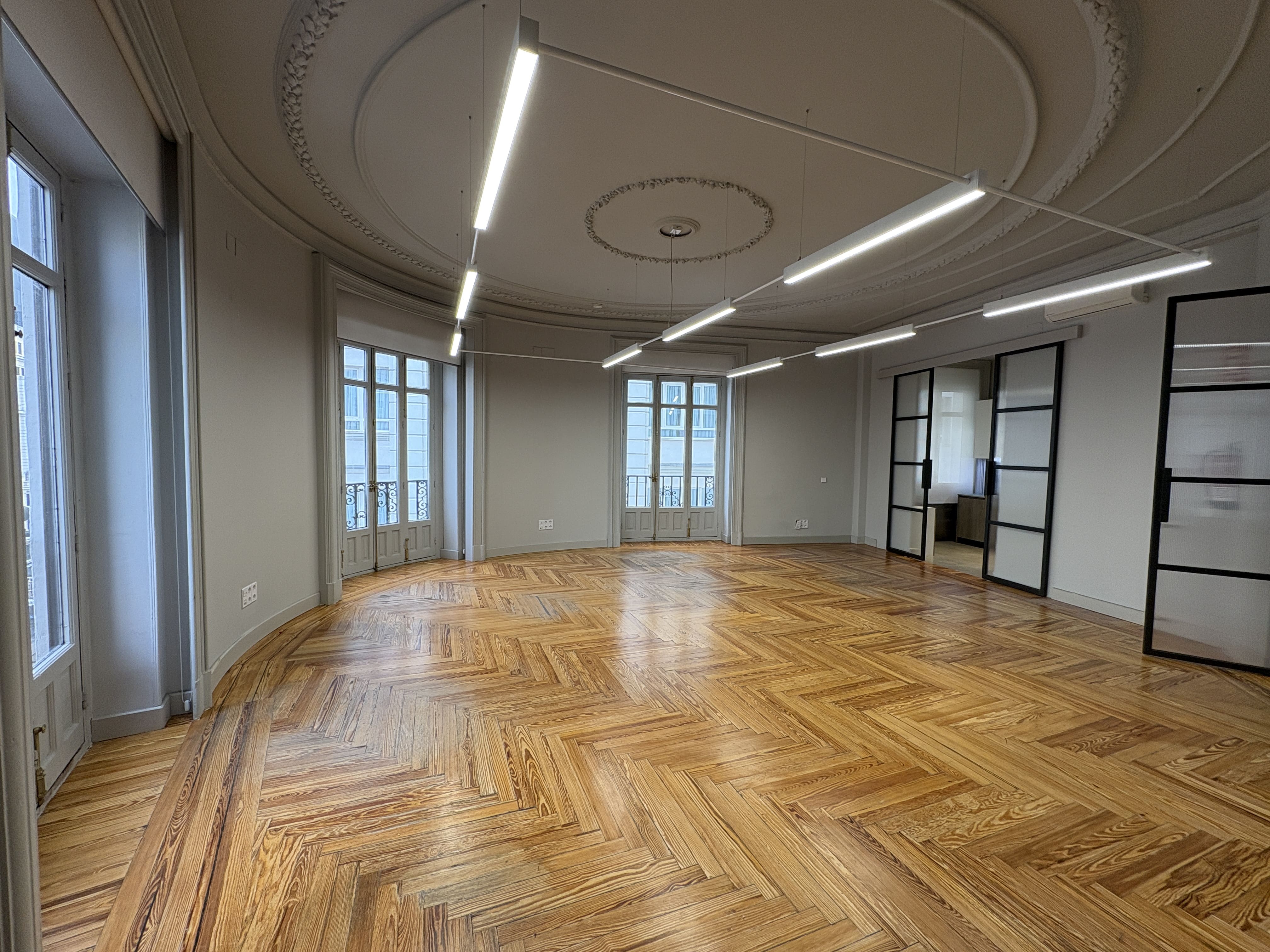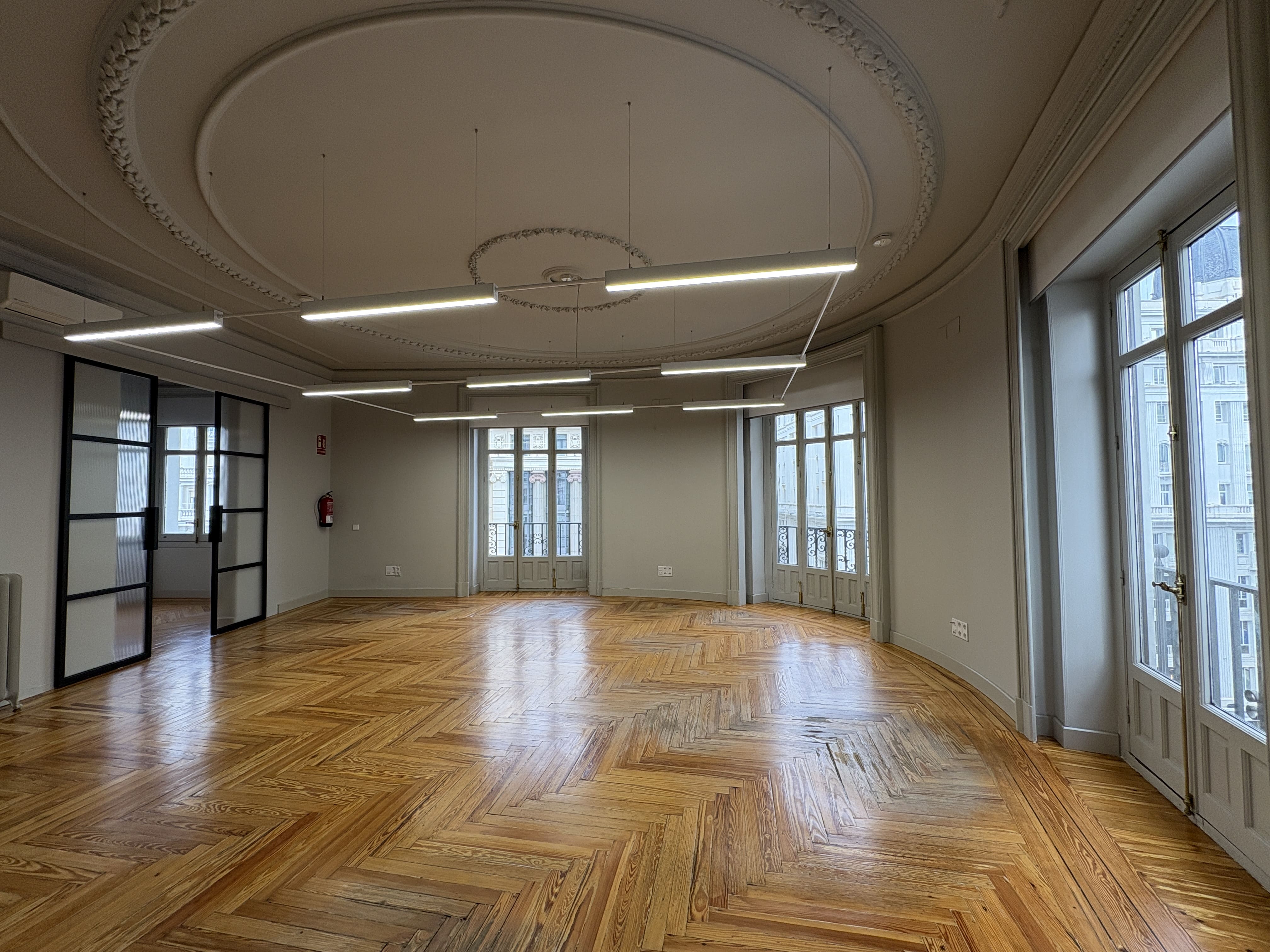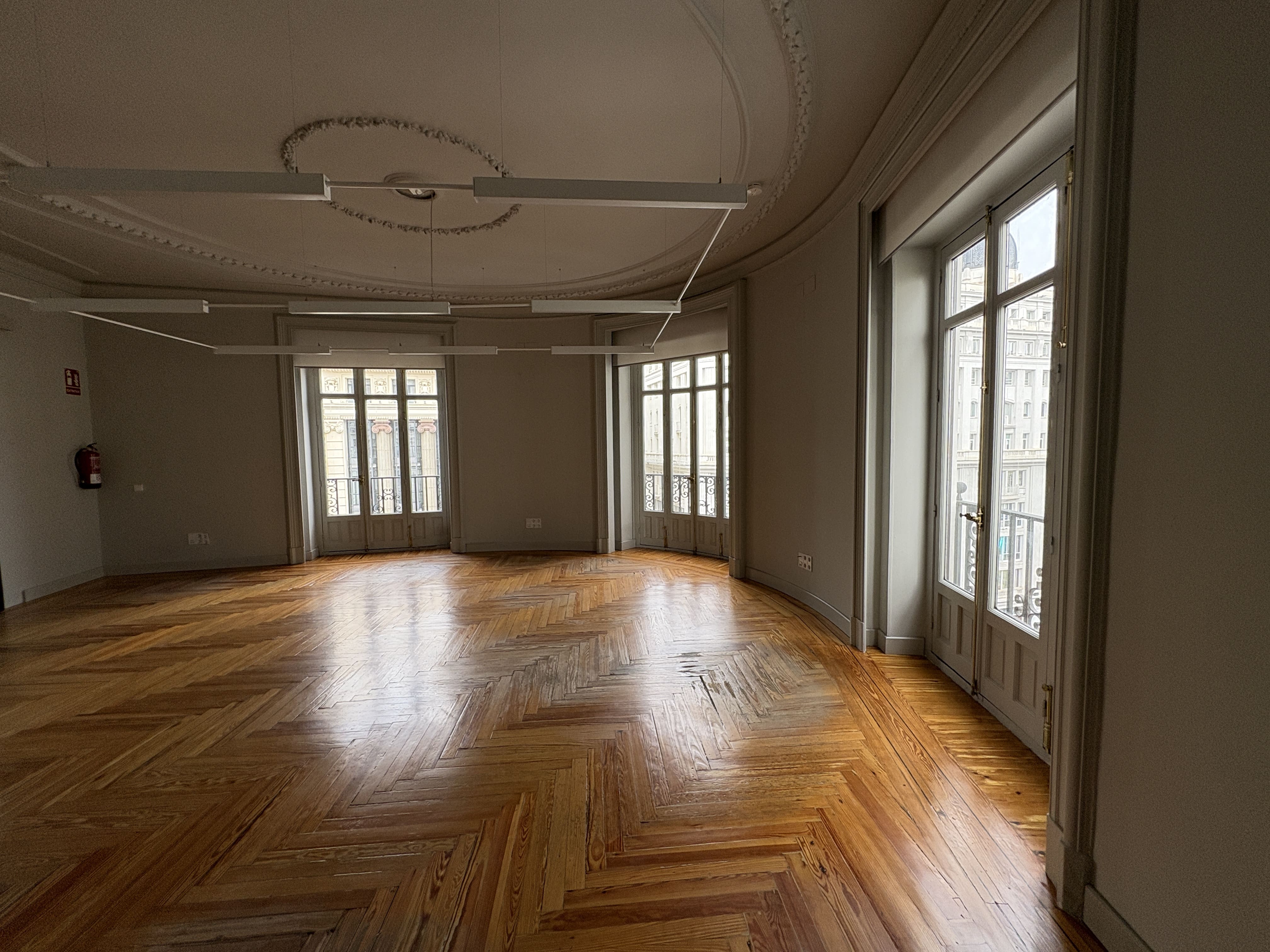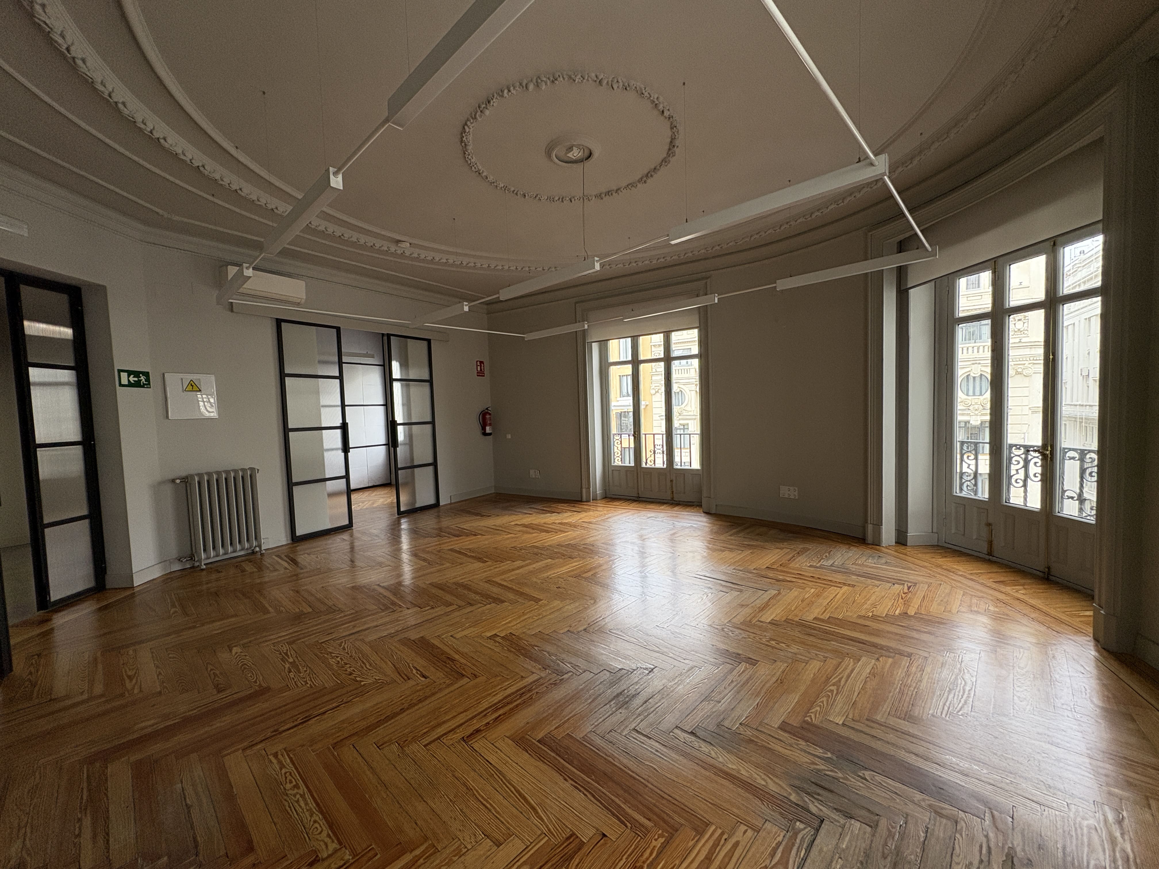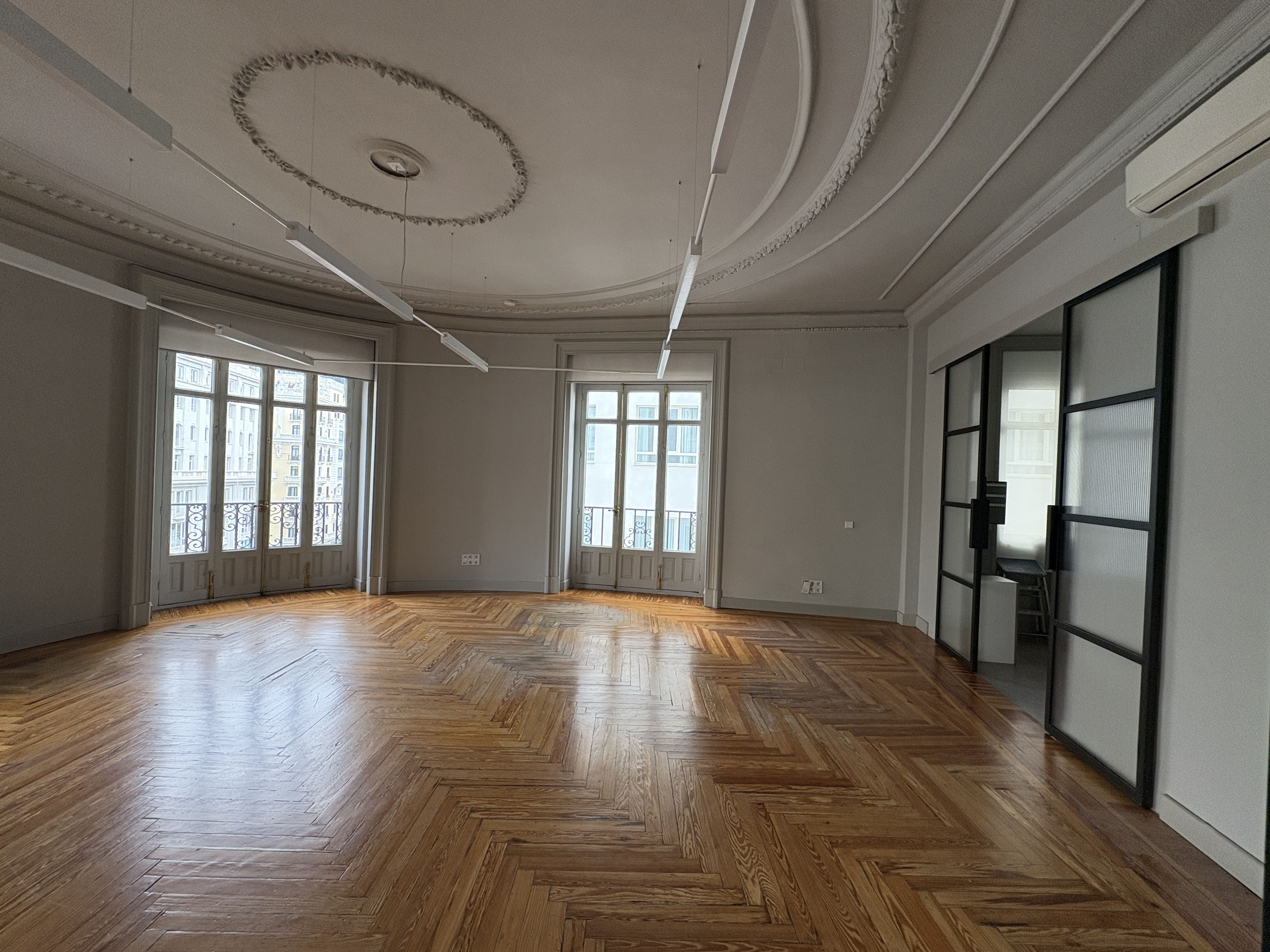 Cuenta con 142 m2, una cocina recientemente reformada, dos baños, una zona de trabajo amplia y tres salas independientes. Los ventanales proporcionan luz natural durante todo el día y ofrecen vistas despejadas a Gran Vía y calles aledañas, mejorando la iluminación del espacio.