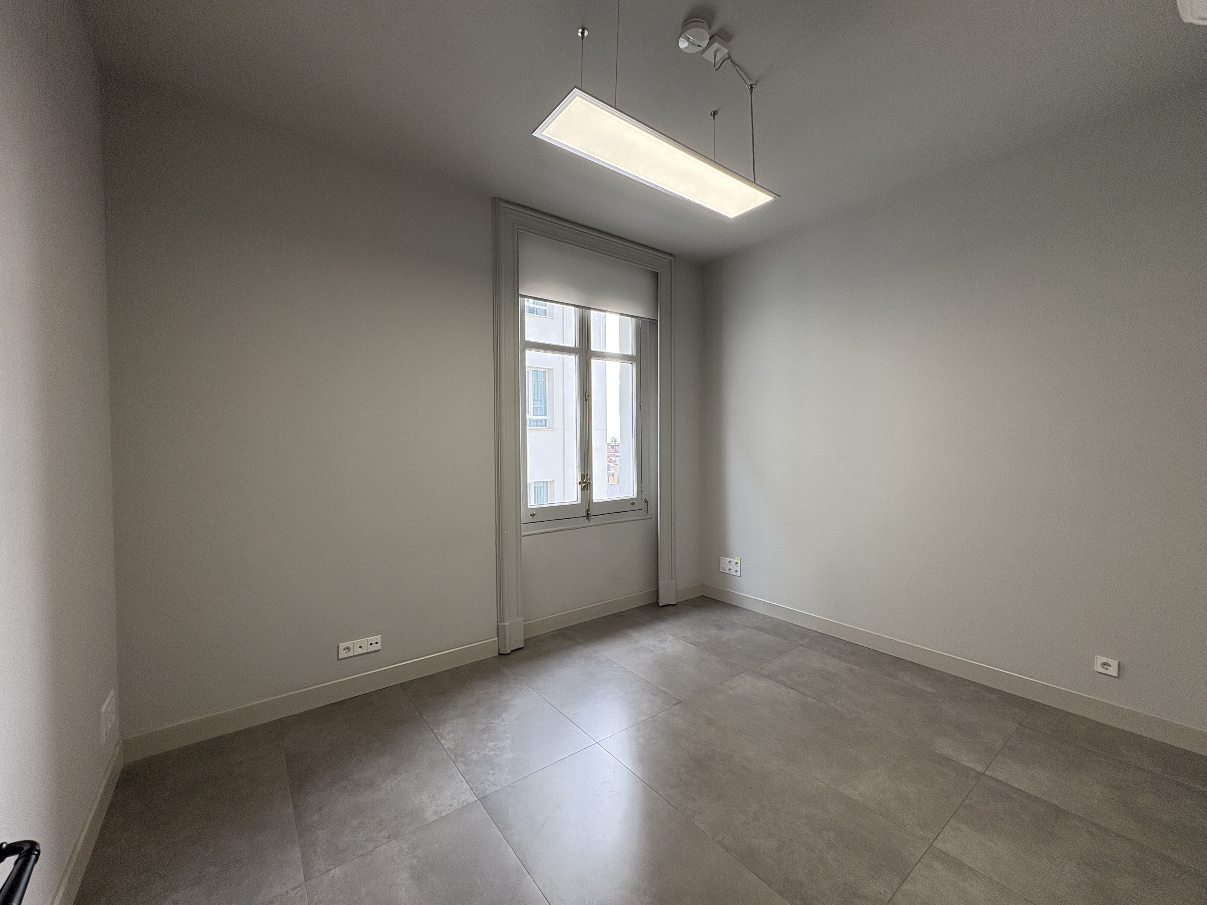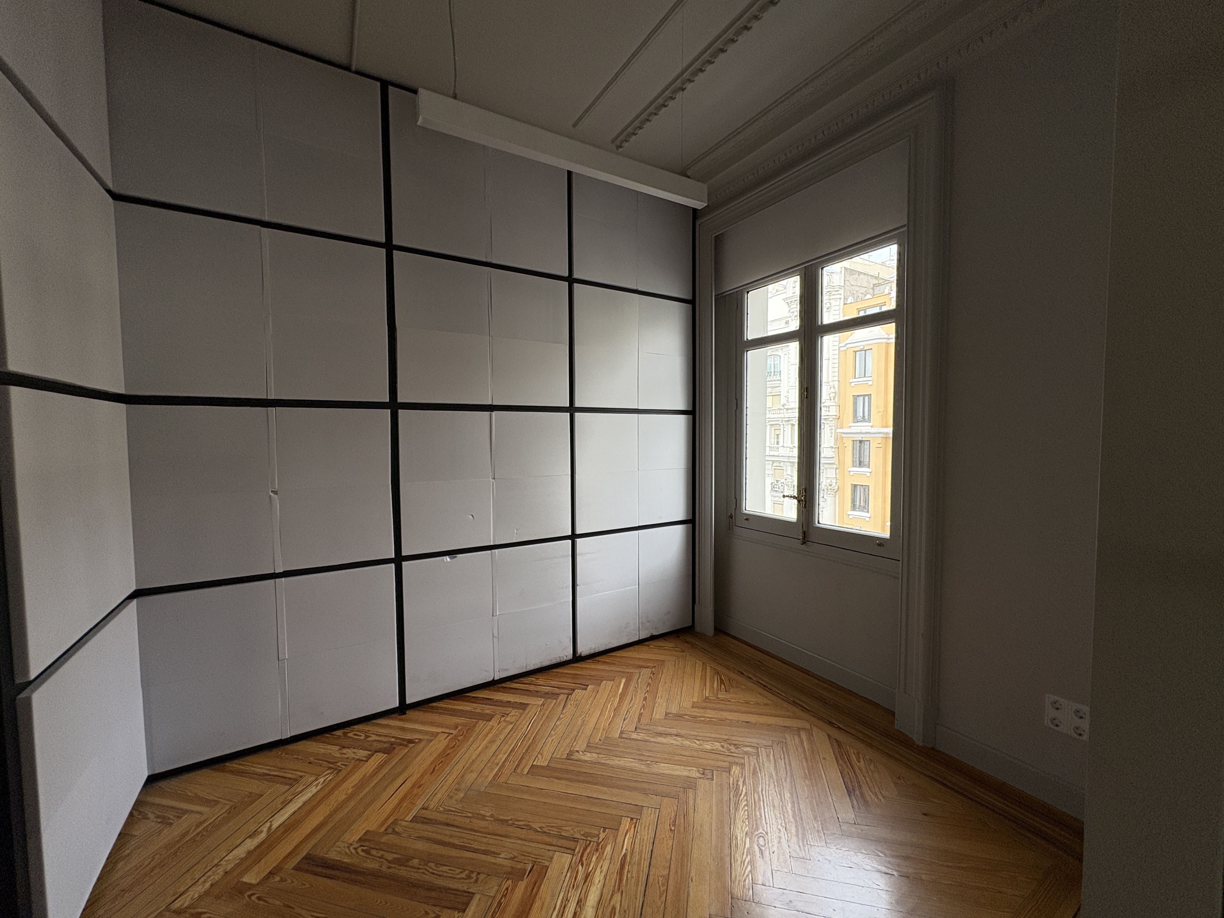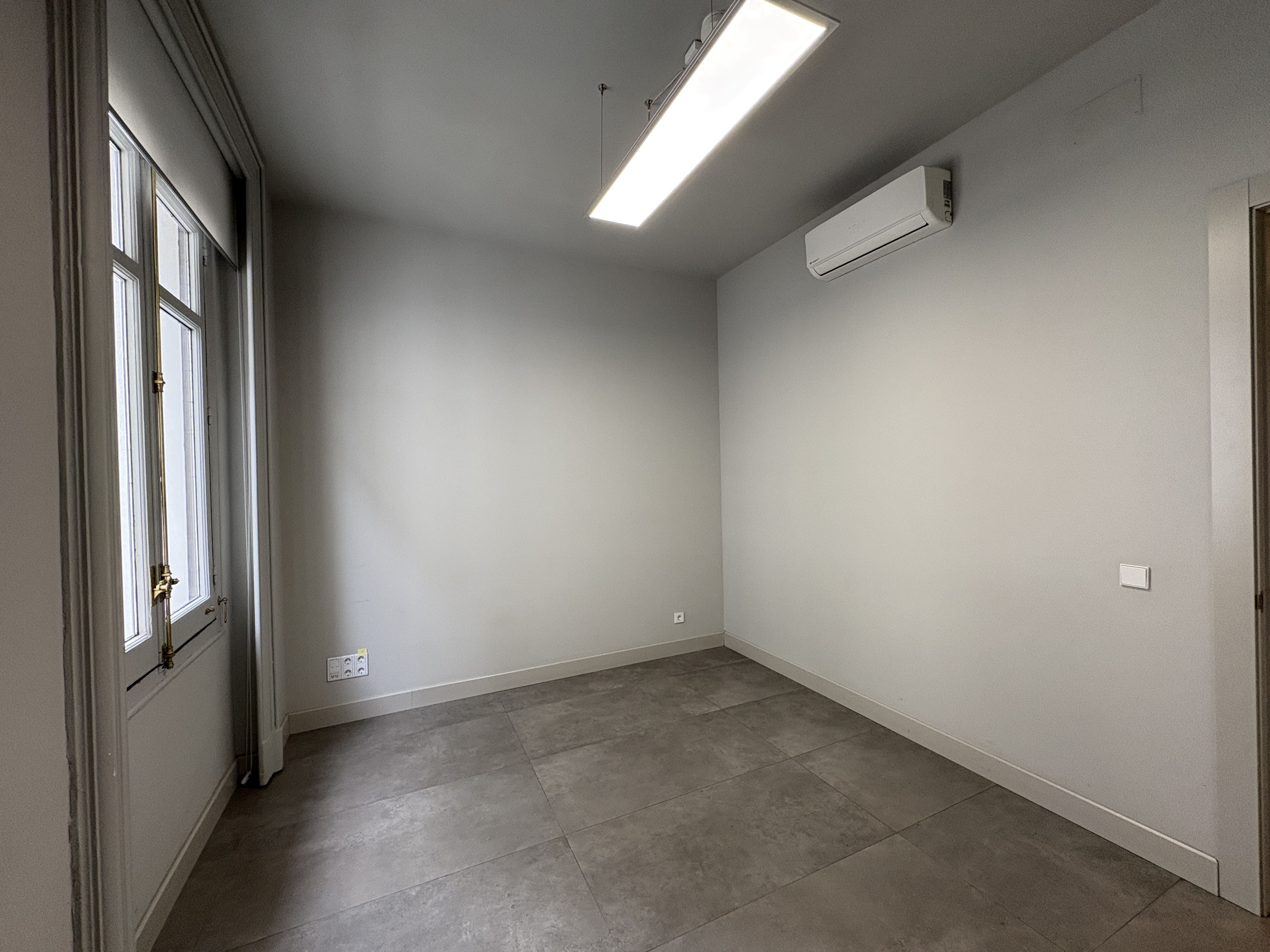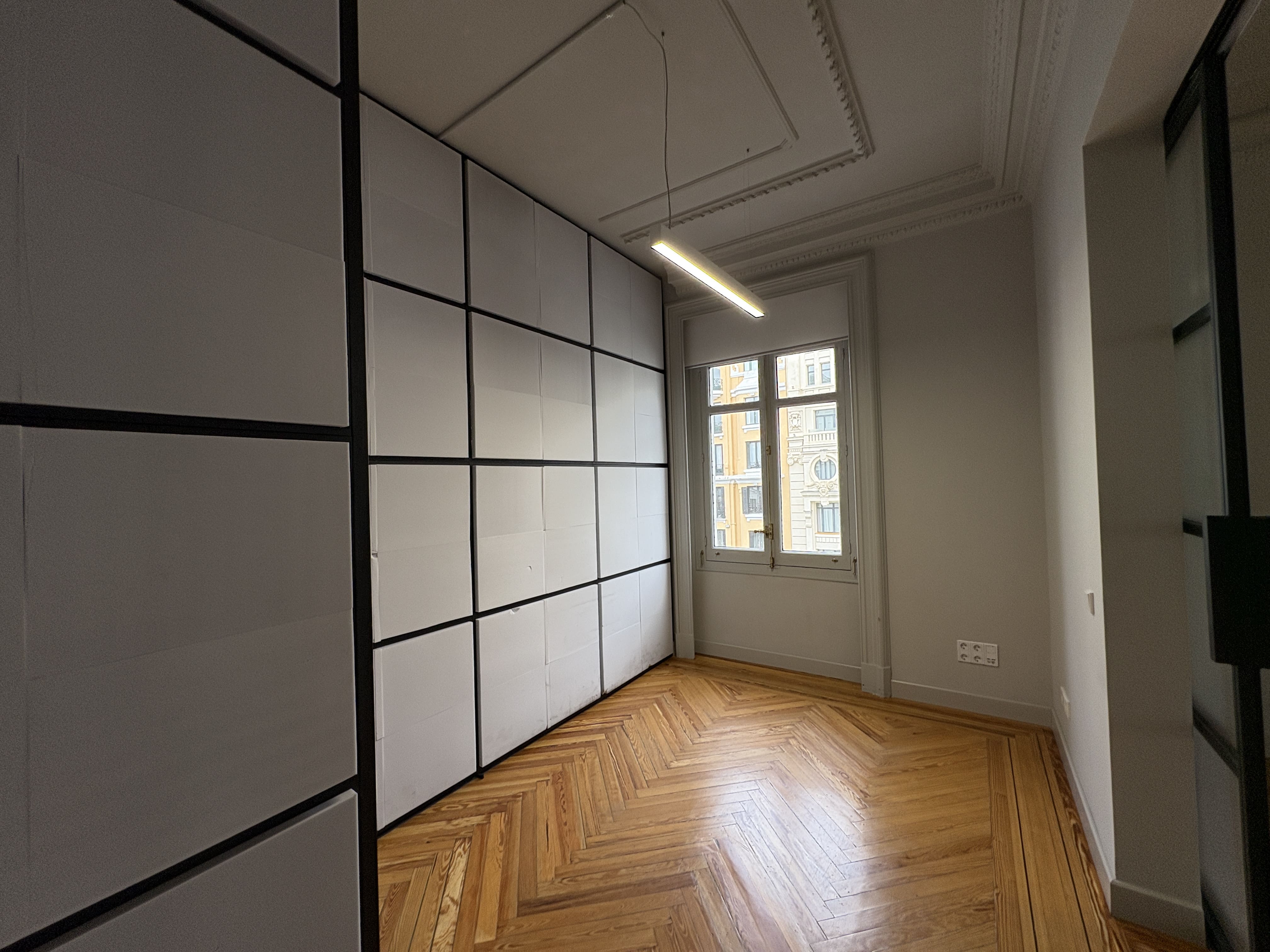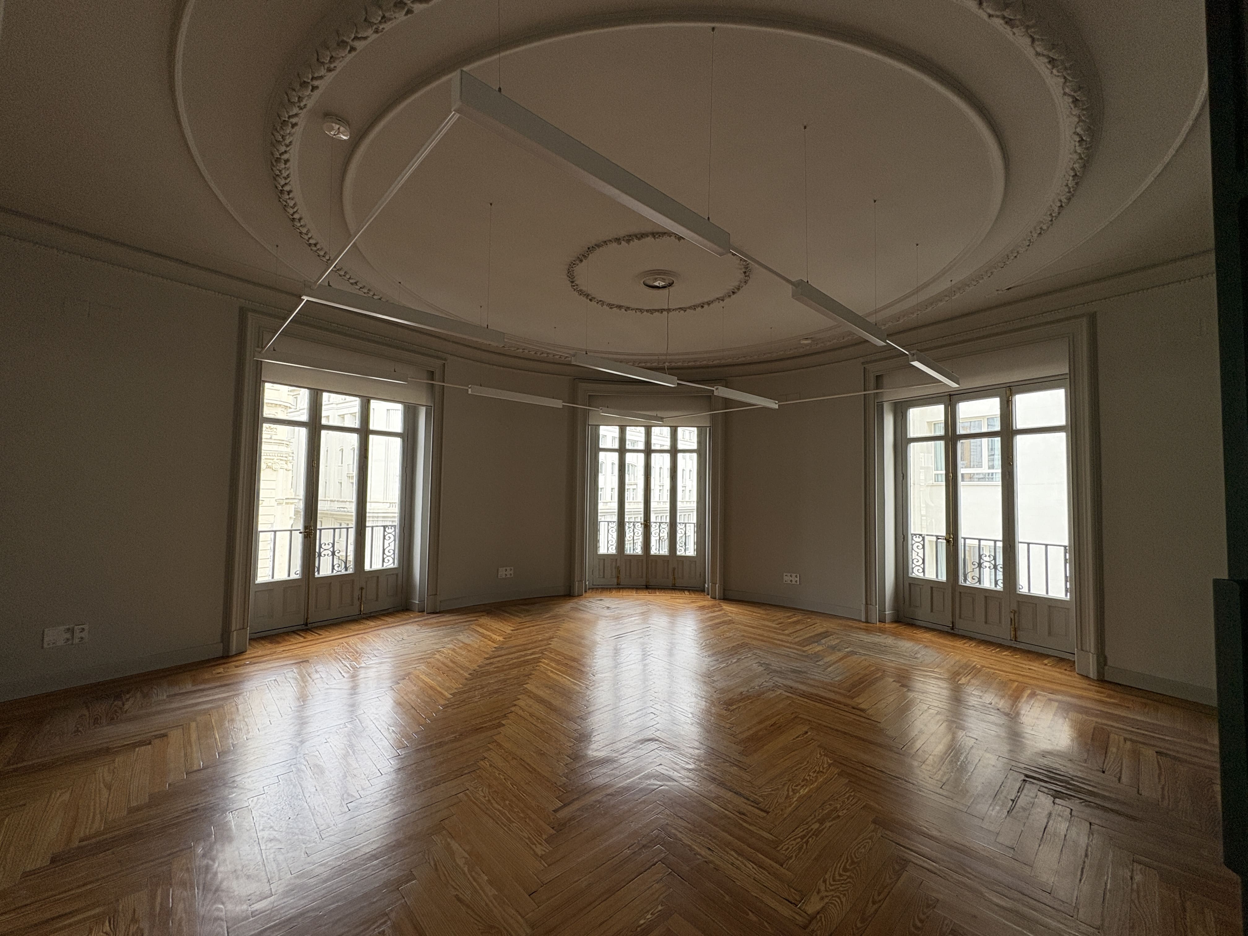 Cuenta con 142 m2, una cocina recientemente reformada, dos baños, una zona de trabajo amplia y tres salas independientes. Los ventanales proporcionan luz natural durante todo el día y ofrecen vistas despejadas a Gran Vía y calles aledañas, mejorando la iluminación del espacio.