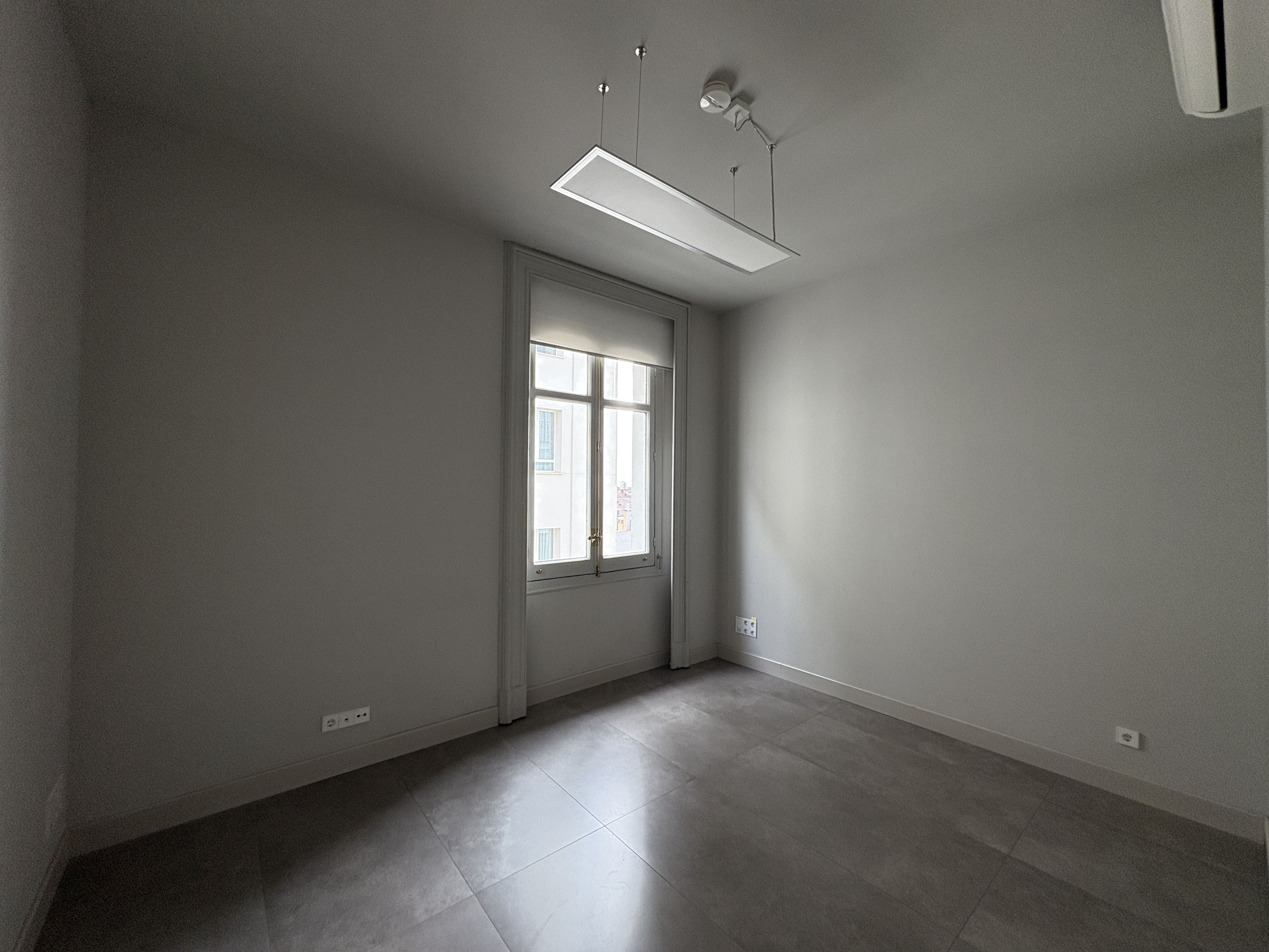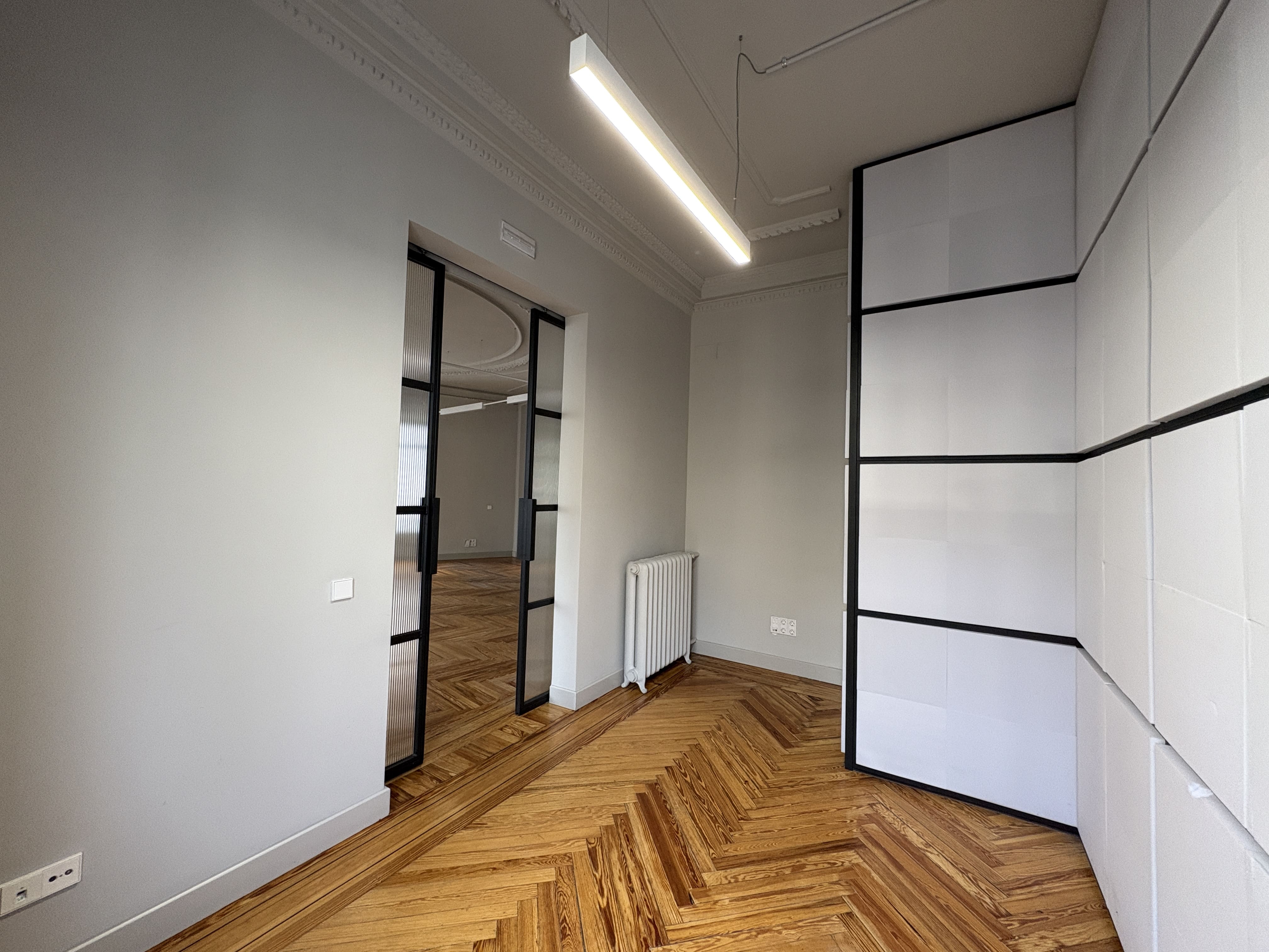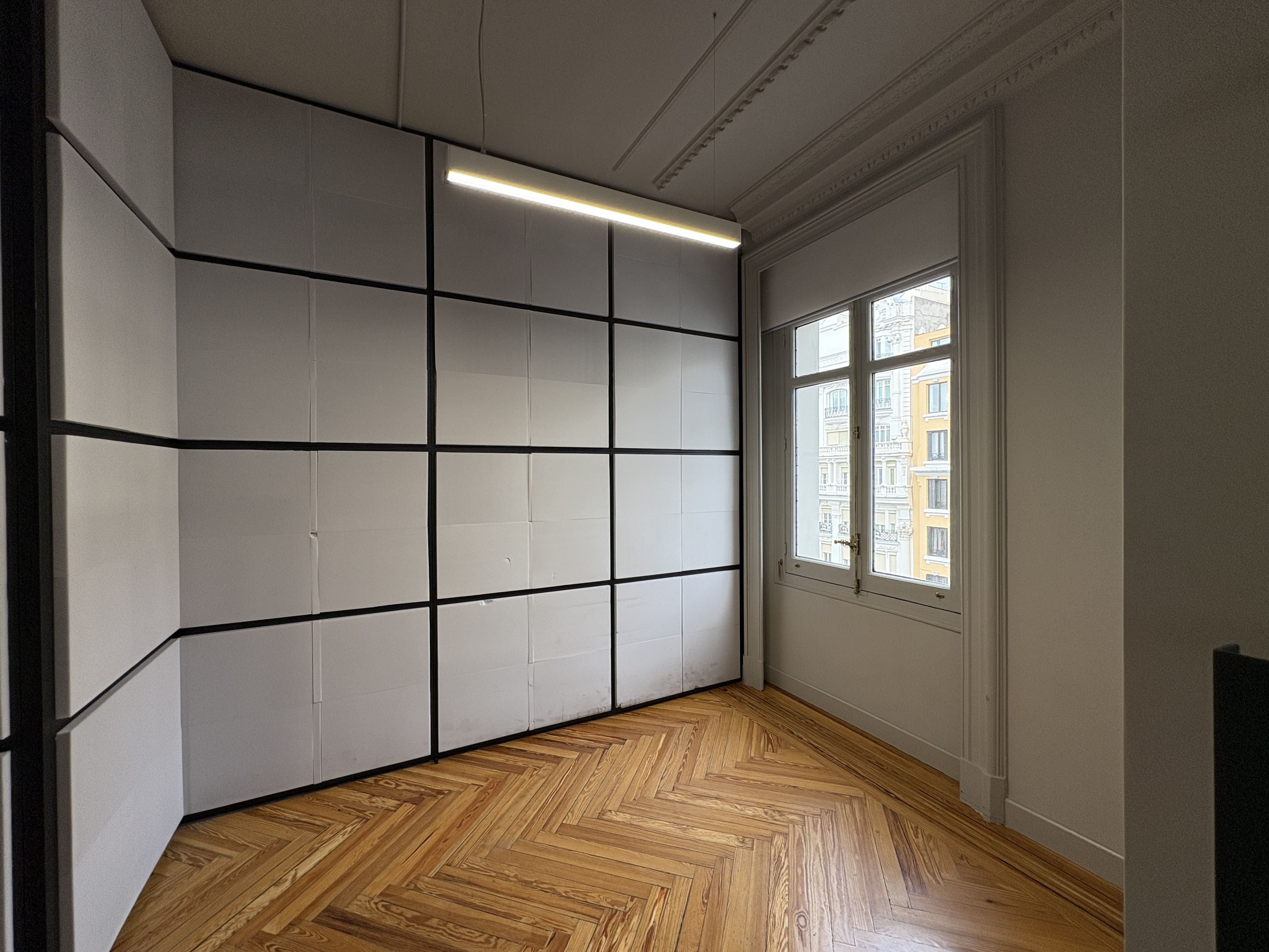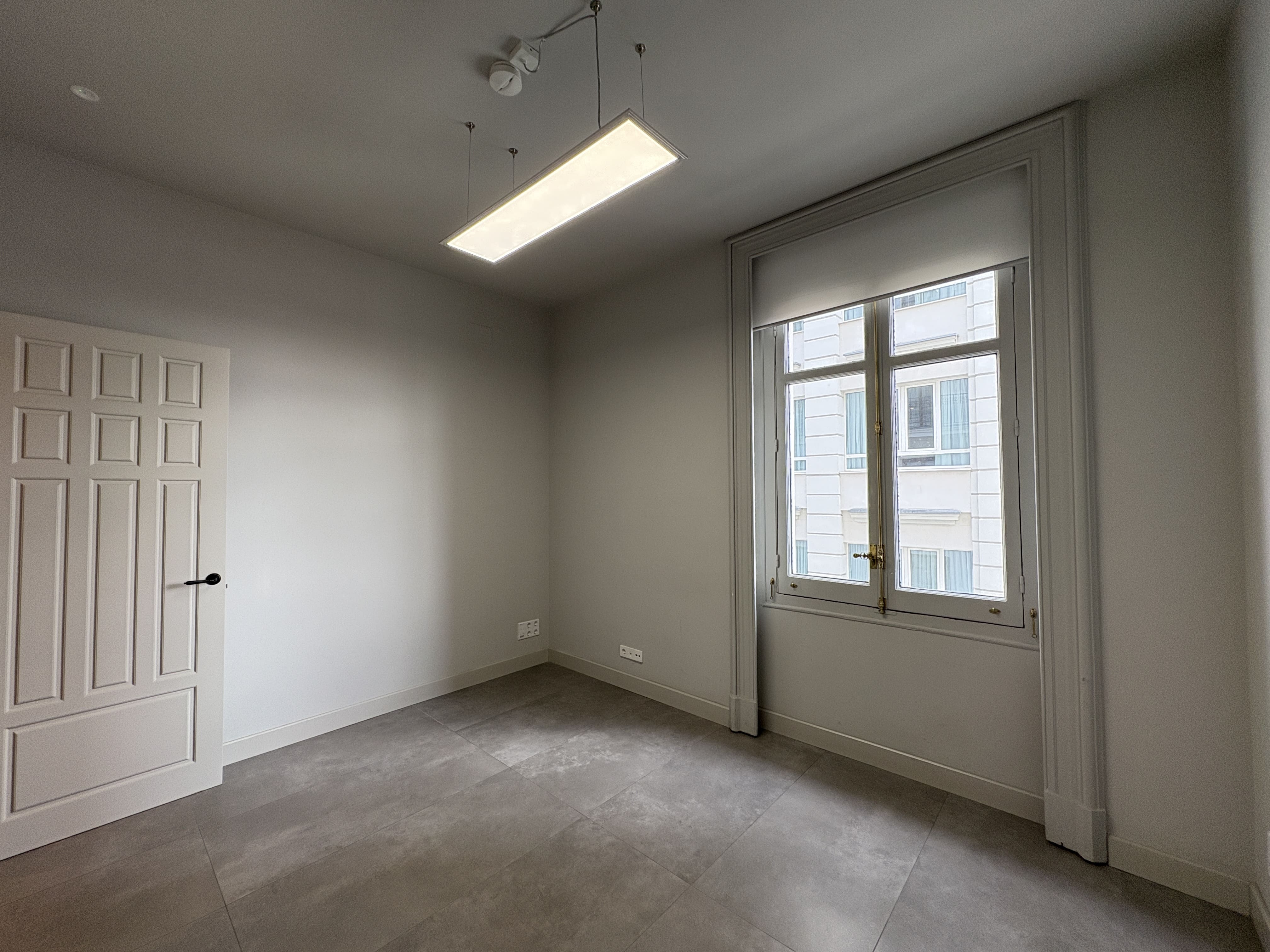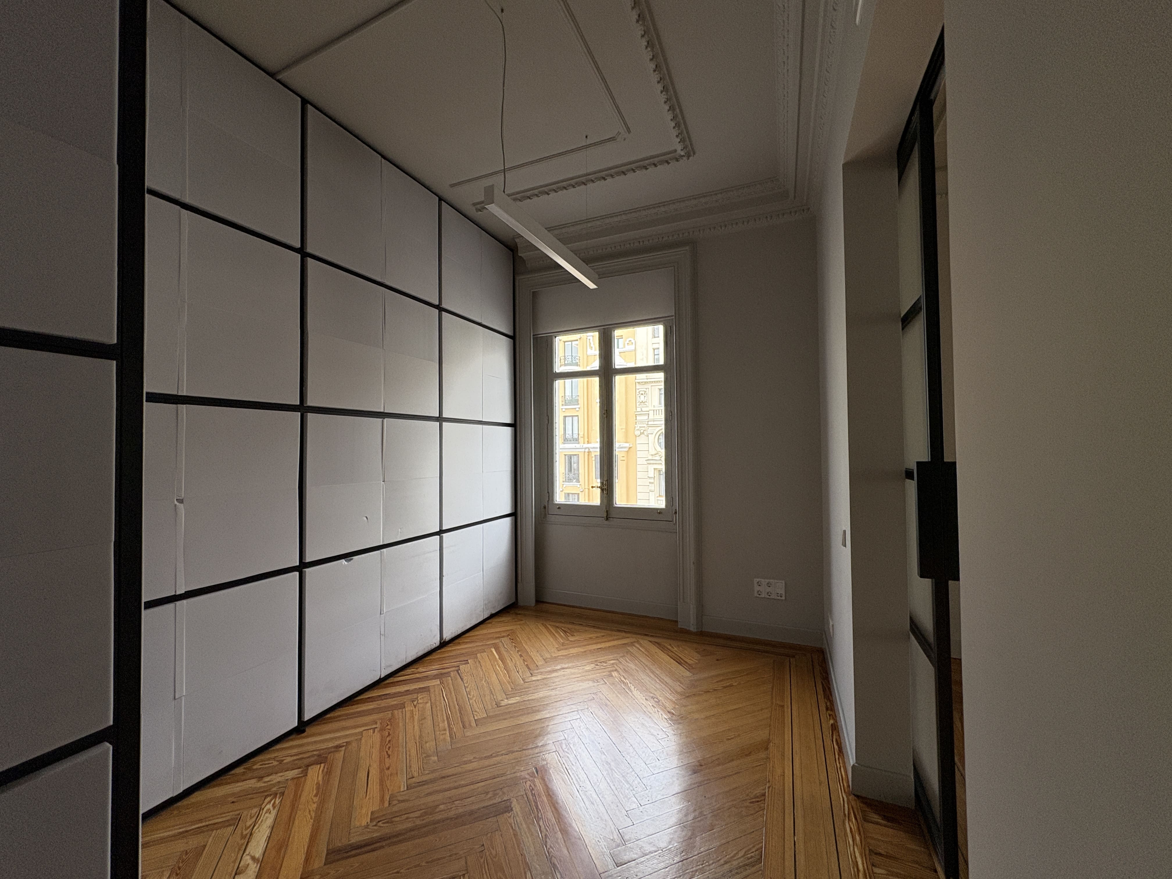 Cuenta con 142 m2, una cocina recientemente reformada, dos baños, una zona de trabajo amplia y tres salas independientes. Los ventanales proporcionan luz natural durante todo el día y ofrecen vistas despejadas a Gran Vía y calles aledañas, mejorando la iluminación del espacio.
