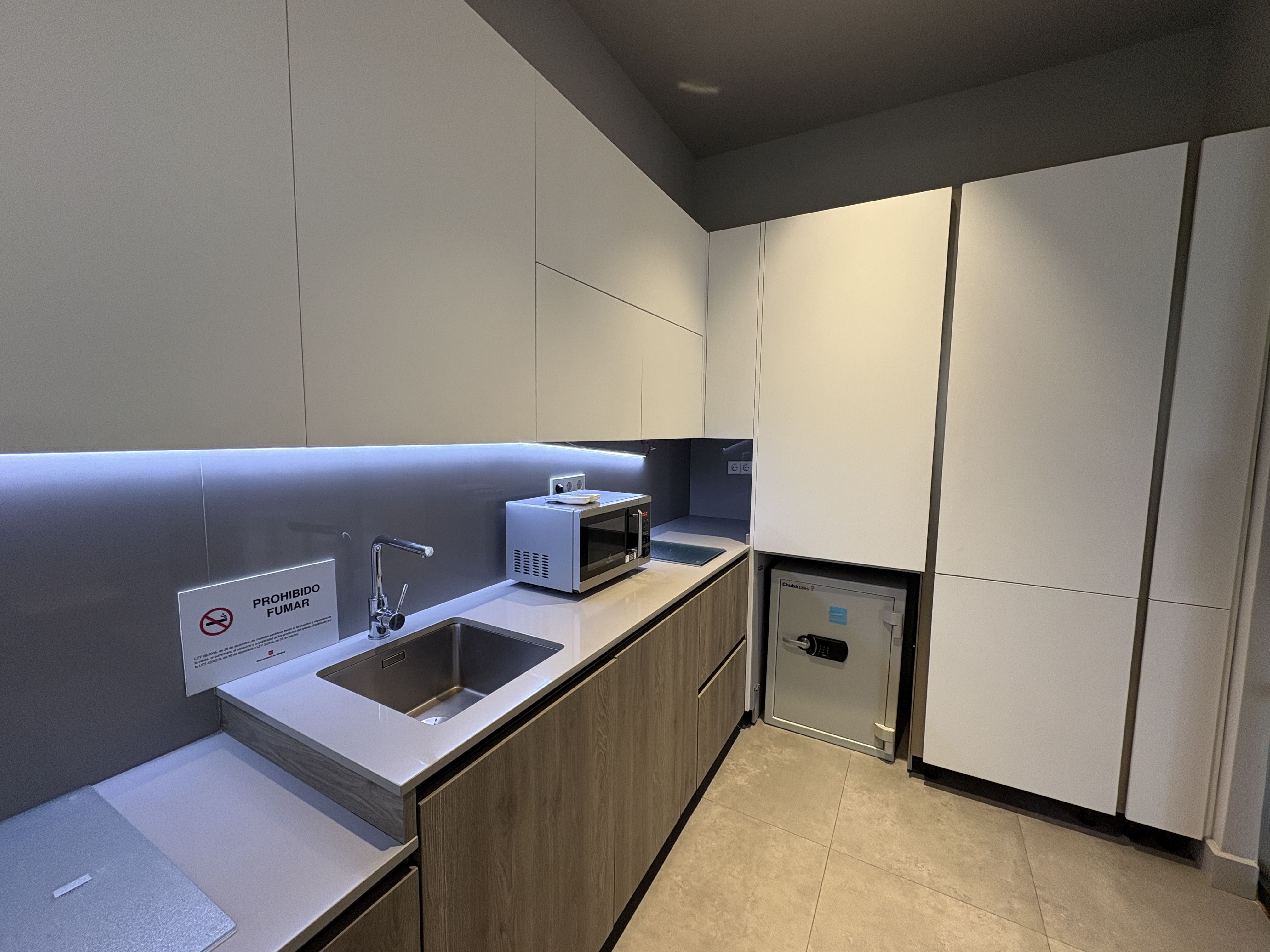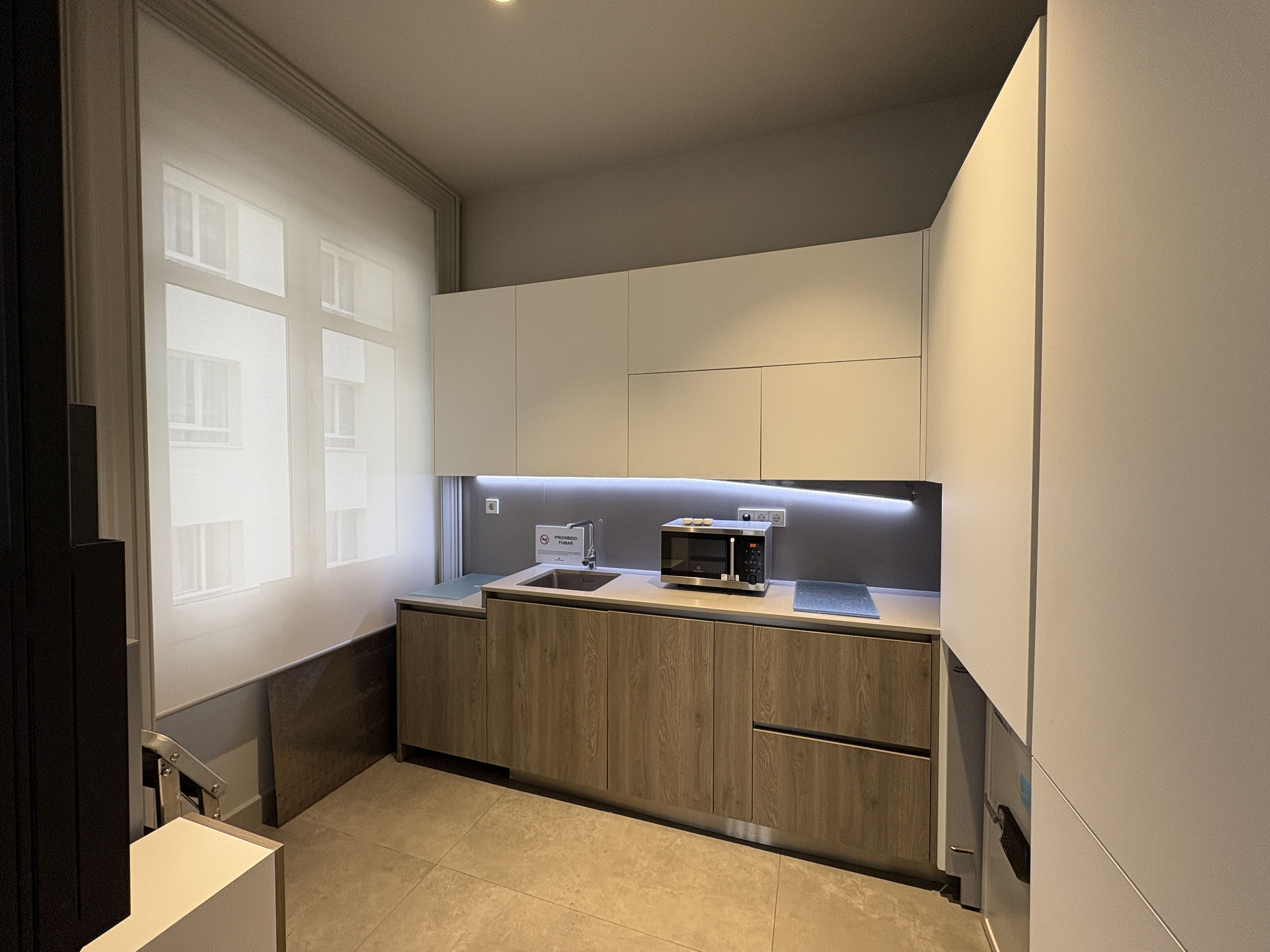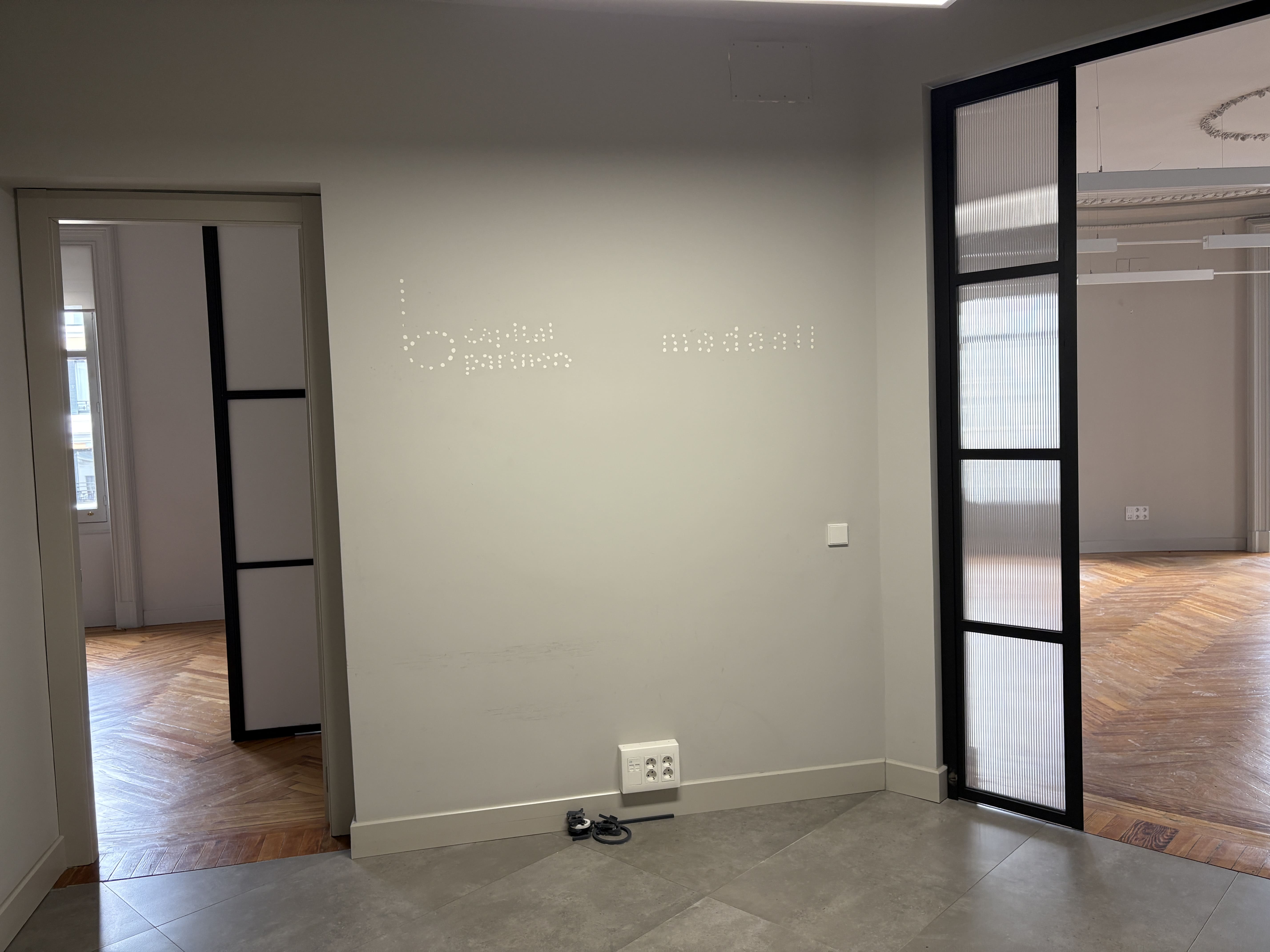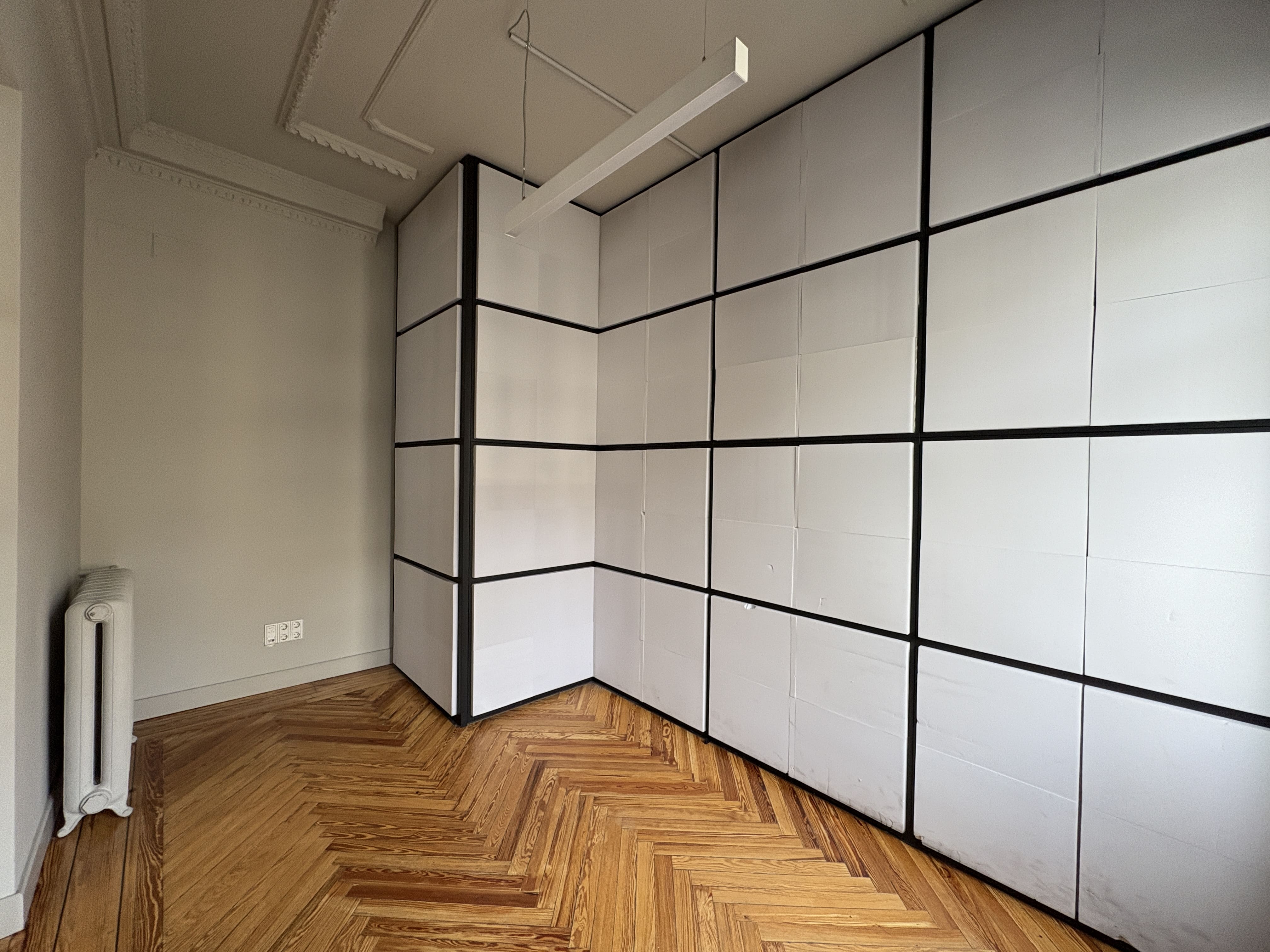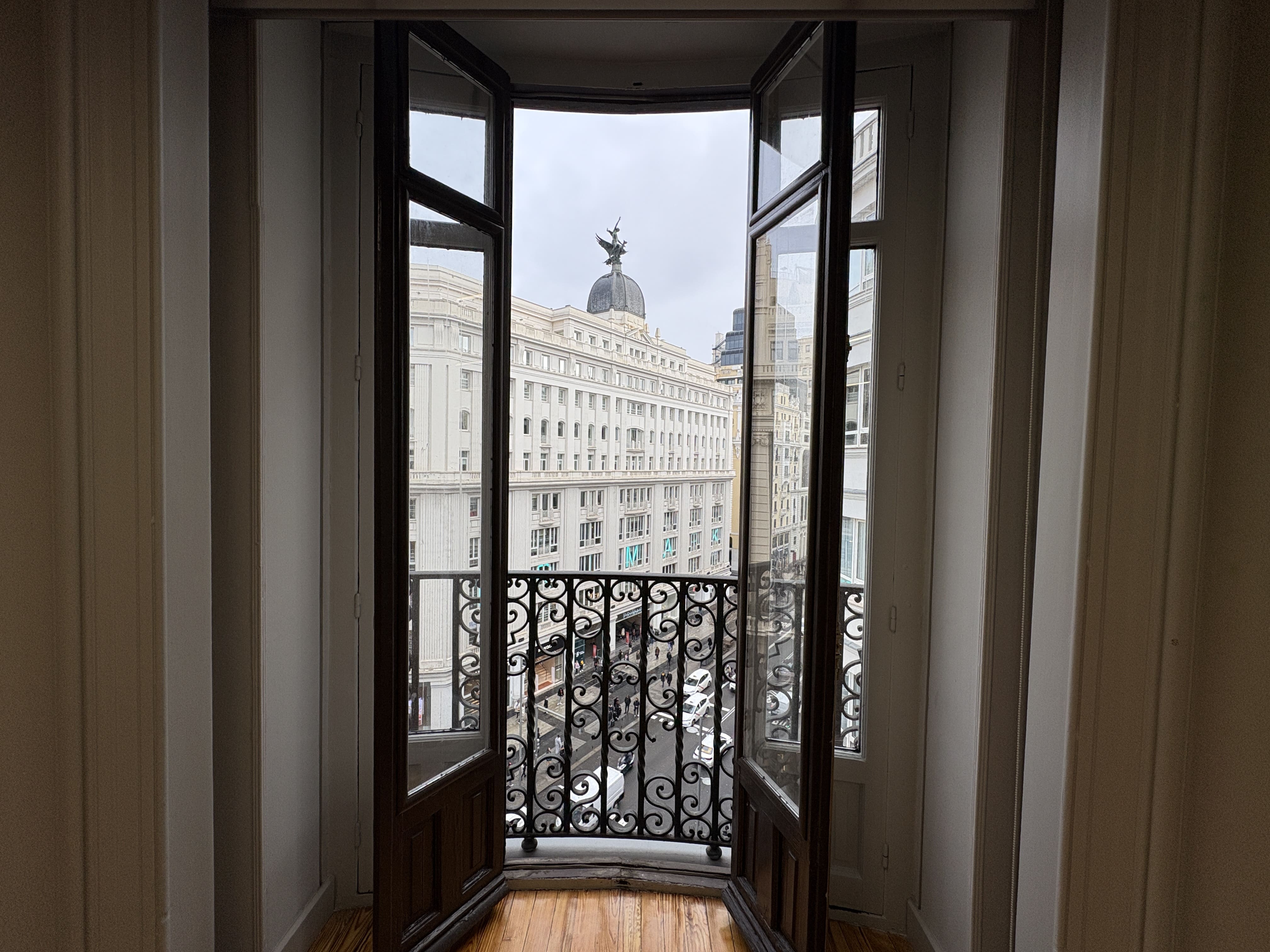 Cuenta con 142 m2, una cocina recientemente reformada, dos baños, una zona de trabajo amplia y tres salas independientes. Los ventanales proporcionan luz natural durante todo el día y ofrecen vistas despejadas a Gran Vía y calles aledañas, mejorando la iluminación del espacio.